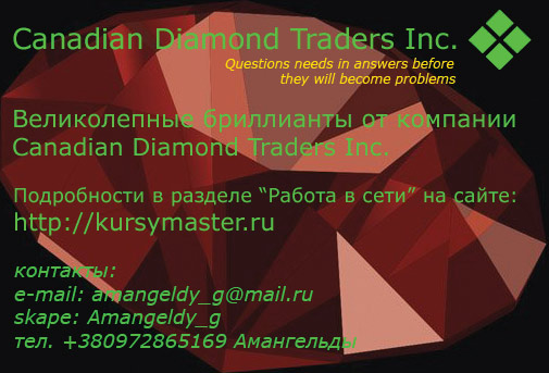 ТРЕЙДИНГ БРИЛЛИАНТОВ И ИЗДЕЛИЙ: В модели продаж компании CDT, кроме обычного интернет магазина, коим она является, имеется маркетинг, позволяющий внести депонированную предоплату за будущий бриллиант, ожерелье или подвеску из бриллиантов (покупку) в размере например, $500 на свой виртуальный счет в компании. Затем предлагается выполнить определенные трудовые действия ТРЕЙДЕРА, по приглашению в компанию новых покупателей, причем неважно - через депозит (частичную предоплату за покупку) или по полной стоимости покупки. Ваш труд учитывается в специальной системе учета. И, хорошо потрудившись через интернет, как трейдер, Вы получаете прекрасную возможность не только приобрести камень, но и заработать бонус в размере от 2300 до 3000 долларов США.