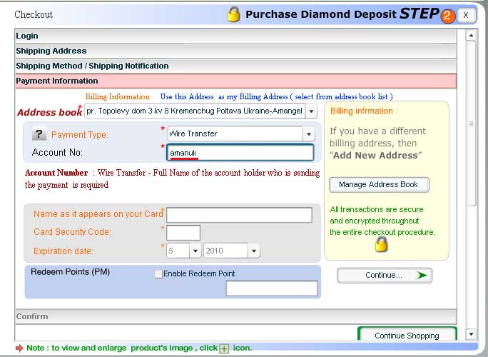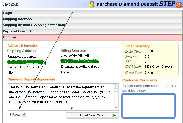 ШАГ 9: Откроется предварительная страница вашего заказа для проверки. Вы еще раз должны проверить ваш адрес, количество заказанных Diamond Deposit, сумму заказа.