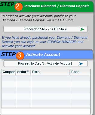 После закупки Алмазного Депозита и его оплаты, вам будет выдан компанией купон для активации вас или другого человека в бизнес. Чтобы увидеть купон и активировать его, войдите в любой электронный кабинет или в пустую анкету и нажмите на горизонтальную узкую кнопку
