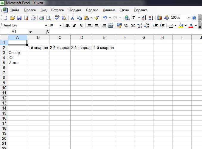 На этом этапе нужно ввести на рабочий лист Лист1 (который находится в рабочей книге Книга1) заголовки строк и столбцов. Когда вы закончите, рабочий лист будет выглядеть так: