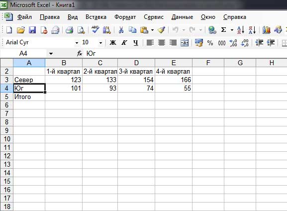 3. Переместите табличный курсор в ячейку А4, введите Юг и нажмите клавишу <Enter>.