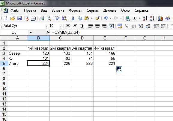 3. Нажмите клавишу <Enter> для ввода формулы. Вы увидите, что в ячейке В5 появилась сумма двух чисел. Вы могли бы повторить ту же операцию для трех оставшихся кварталов, но гораздо проще скопировать формулу в три ячейки, расположенные справа.