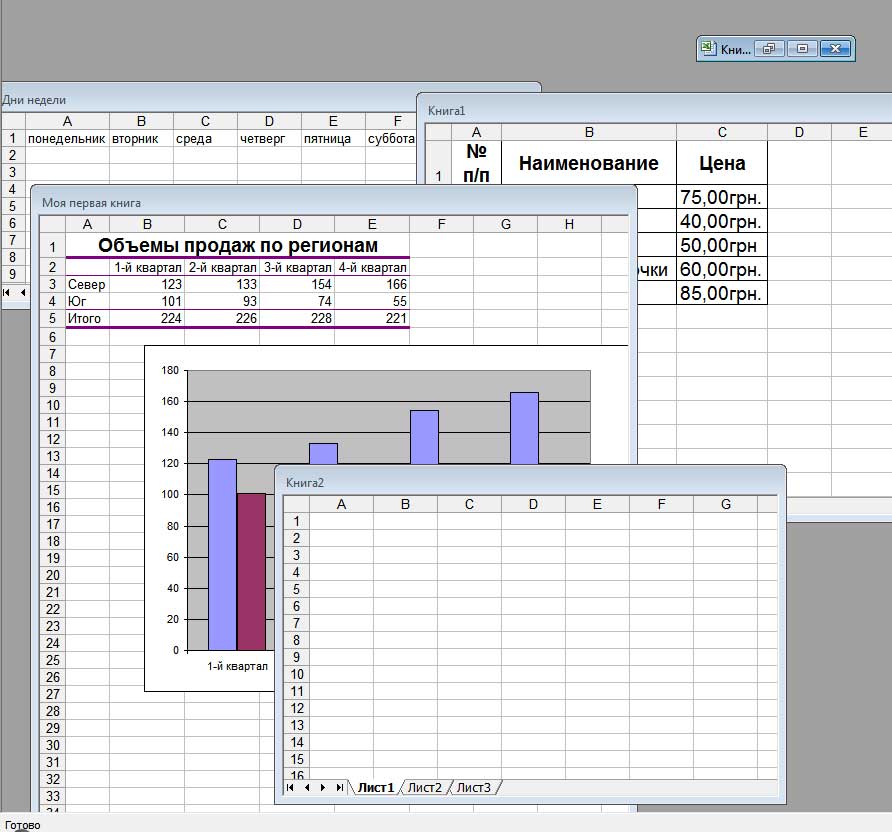 В Excel можно открыть несколько рабочих книг, каждая из которых находится в отдельном окне. На рисунке видно, что одно из окон свернуто и видна только его строка заголовка. Обратите внимание на то, что окна рабочих книг могут перекрываться, но при этом строка заголовка одного из окон будет выделена более ярким цветом Это то окно, в котором находится активная рабочая книга.