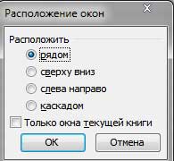 Иногда необходимо, чтобы все окна рабочих книг были видны (т.е. не заслоняли друг друга). Это, конечно, можно сделать и вручную, соответствующим образом изменив размеры окон и расположив их на экране. Однако Excel позволяет сделать это автоматически. Команда Окно-Расположить открывает диалоговое окно. С его помощью можно расположить окна на экране четырьмя различными способами. Выберите нужную опцию и щелкните на кнопке ОК.