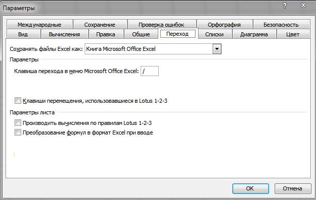Действие некоторых клавиш может отличаться в зависимости от установленных вами опций перехода. Выберите команду Сервис-Параметры и щелкните на вкладке Переход в диалоговом окне Параметры. Если установлен флажок опции Клавиши перемещения, использовавшиеся в Lotus 1-2-3, то клавиши перемещения табличного курсора будут соответствовать тем, которые использовались в программе Lotus 1-2-3. Но лучше использовать стандартные клавиши управления табличным курсором Excel, а не управляющие клавиши Lotus 1-2-3.
