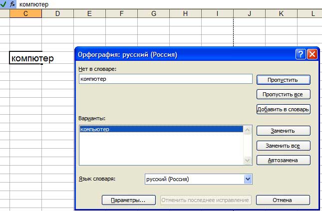 Чтобы исправить ошибку достаточно выделить ячейку в которой находится текст и нажать на кнопку Правописание, программа откроет диалоговое окно, из которого надо выбрать правильное слово, нажать кнопку заменить и ошибка сразу выправится. Например, в слове компютер допущена ошибка, программа предлагает заменить его правильным словом - компьютер, выберем заменить и исправляем допущенную ошибку.