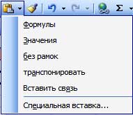 Кнопка вставить раскрывает выпадающий список, из которого можно выбрать параметры вставки.