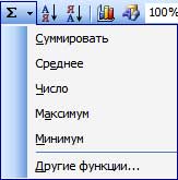 - Автосумма. Автоматически суммирует выделенный диапазон чисел, также раскрывает выпадающий список параметров суммирования. С помощью данного списка можно найти среднее значение чисел их максимальное и минимальное значения и другие параметры.