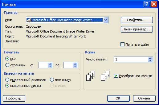 В верхнем окне имя выбирается принтер, если у вас их несколько, или по локальной сети. В параметрах Печатать все - печатает текущий лист книги, это то же самое если щелкнуть на кнопке печать панели инструментов Стандартная; страницы с: - можно указать номера страниц, щелкая на стрелочки или ввести номера страниц вручную.