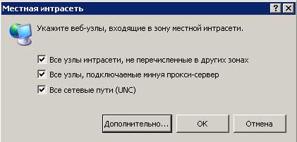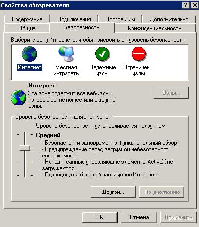 Интернет – содержит веб-узлы, не отнесенные к какой-либо другой зоне. Уровень безопасности заданный по умолчанию, средний.