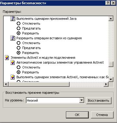 3. в появившемся окне Правила безопасности произведите необходимые установки для каждой настройки безопасности, выбрав одну из следующих опций. Разрешить – загрузка и выполнение объекта разрешается без отображения предостережений. Предлагать – загрузка и выполнение объекта разрешается лишь после подтверждения пользователя. Отключить - загрузка и выполнение объекта запрещается.