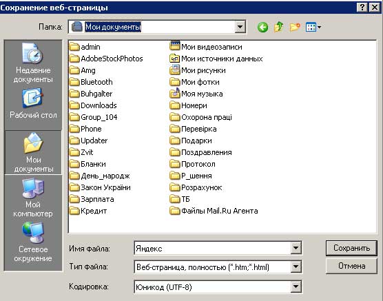 Укажите где нужно сохранить документ, выбрав необходимую папку. В поле Имя файла введите соответствующее имя, в поле Тип файла выберите тип файла. Чтобы сохранить все файлы, необходимые для отображения данной страницы, включая рисунки, кадры и таблицы стилей выберите вариант Веб-страница полностью. В этом случае сохранятся все файлы в соответствующих форматах.