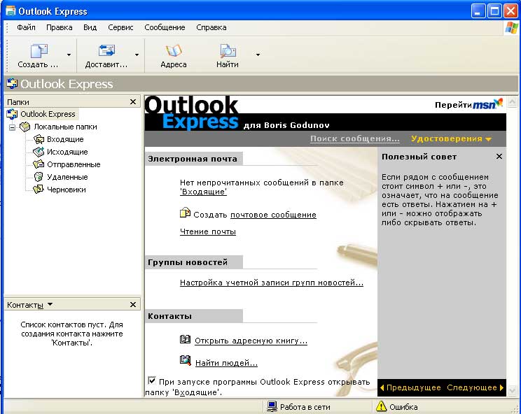 Основную часть экрана составляют два окна – окно с деревом папок в левой части и окно просмотра в правой части. Главной папкой является папка с именем программы (Outlook Express), когда она активизирована, в окне программы видны крупные пиктограммы, дающие доступ к основным режимам программы.