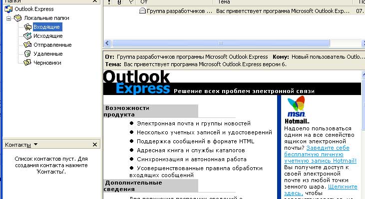 Активизируя папку Входящие, можно увидеть список всех сообщений, которые к вам поступили. При первом запуске программы в данной папке будет два сообщения. В этом случае окно просмотра делится на два равных окна. В одном из которых размещается список сообщений, а в нижнем текст выделенного сообщения.