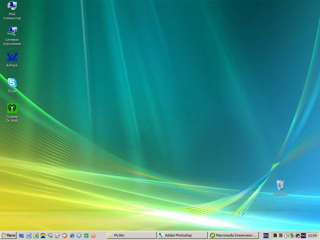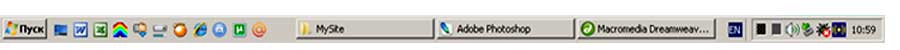 На этой панели задач вы видите, что у меня в данный момент работают следующие программы: Adobe Photoshop, в которой я обрабатываю все картинки данного сайта, программа Macromedia Dreamweaver - визуальный HTML-редактор, с помощью которой я собственно и создаю этот сайт.